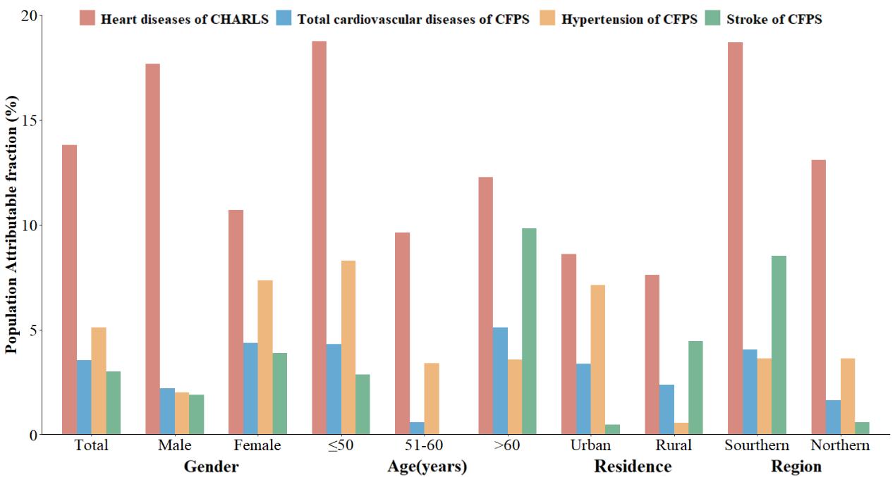基于兩個前瞻性隊列(中國健康與養老追蹤調查CHARLS、中國家庭追蹤調查CFPS),本研究評估了O3日最大8h濃度(MDA8 O3)與循環系統疾病、心臟病、高血壓和卒中發生風險的關聯,并通過計算人群歸因分值(PAF)來評估O3暴露造成的疾病負擔。研究發現:在CHARLS隊列中,MDA8 O3暴露濃度每增加10ppb,心臟病的發病風險增加31%;在CFPS隊列中,MDA8 O3暴露濃度每增加10ppb,心腦血管系統疾病和高血壓的發病風險分別增加7%和10%。隨著O3濃度上升,男性群體和居住在中國北方地區居民發生心臟病的風險更高、城市居民發生高血壓的風險更高、生活在中國南方地區的居民發生腦卒中的風險更高(圖2)。