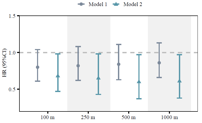 本研究共納入8481名研究對象,平均年齡為62.05±8.63歲,平均隨訪時間為7.00±2.51年,隨訪總?cè)四陻?shù)為58972人年,共有190人(2.24%)在隨訪中被診斷為抑郁。在控制相關(guān)混雜因素后,研究發(fā)現(xiàn),居住地500m范圍內(nèi)的歸一化植被指數(shù)(NDVI)每增加1個四分位數(shù)間距(IQR),對應(yīng)的抑郁發(fā)生風(fēng)險(xiǎn)比(HR)為0.60。100m、250m和1000m居住范圍內(nèi)的NDVI值每增加1個IQR,對應(yīng)的HR值分別為0.68、0.65和0.61(圖2)。