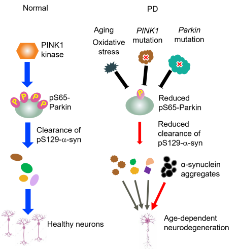 (圖1.磷酸化Parkin在PD病理中的重要機制模型。在正常的靈長類動物大腦中,PINK1蛋白發揮激酶功能磷酸化激活Parkin,磷酸化形式的S65-Parkin通過清除pS129-α-syn等毒性蛋白使黑質神經元維持健康狀態。然而,PD病人腦內,當發生Parkin 或 PINK1 突變以及衰老造成的氧化應激時Parkin磷酸化水平降低,進而導致 pS129-α-syn 等毒性蛋白積累,并最終導致患者腦內發生年齡依賴性的神經退變)