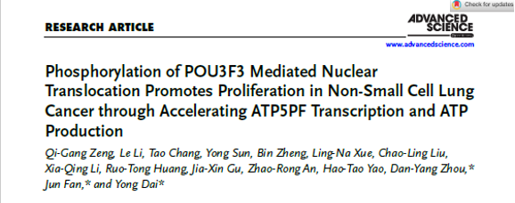 暨南大學(xué)融媒體中心訊 近日,暨南大學(xué)基礎(chǔ)醫(yī)學(xué)與公共衛(wèi)生學(xué)院范駿、中醫(yī)學(xué)院戴勇和南京市第一醫(yī)院周丹陽團隊在中科院一區(qū)top期刊Advanced Science(IF=14.3)上發(fā)表了題為“Phosphorylation of POU3F3 Mediated Nuclear Translocation Promotes Proliferation in Non-Small Cell Lung Cancer through Accelerating ATP5PF Transcription and ATP Production”的研究成果,深入探討了非小細胞肺癌(NSCLC)中,八聚體結(jié)合蛋白3(POU3F3)異常高表達通過促進NSCLC細胞ATP生成,進而推動NSCLC進展的具體分子機制。